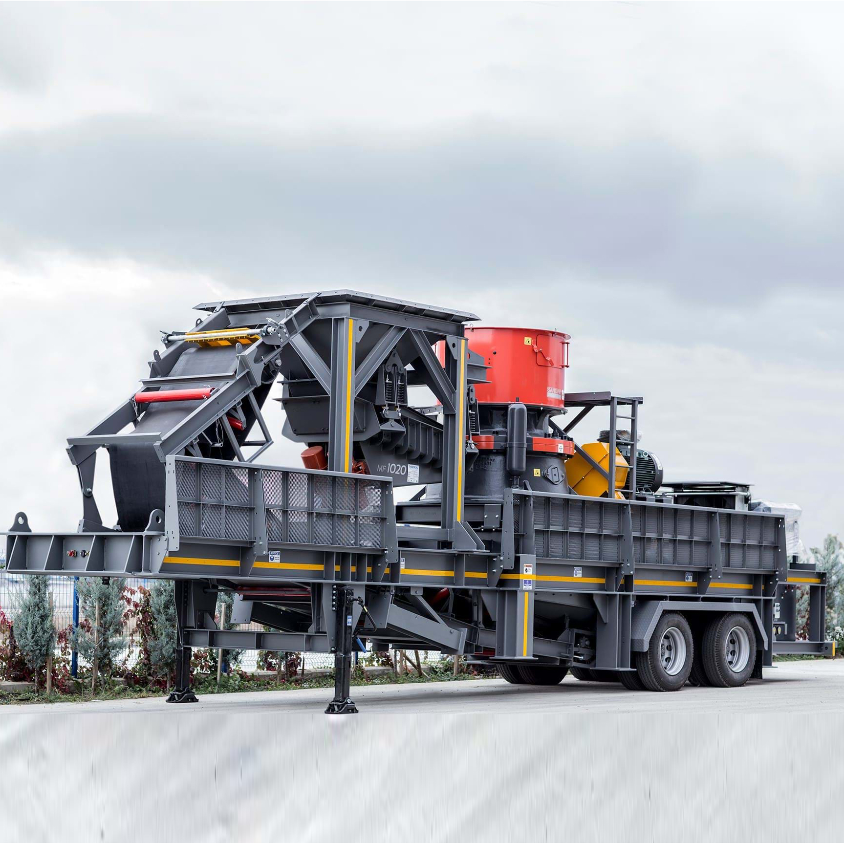 1. Конвейерная лента передней рукояти 2. Платформы для удобного осмотра 3. Конвейерная лента бокового склада 4. Вибрационный грохот с большим ходом 5. Конвейерная лента основной подачи 6. Конвейер обратной связи увеличенного размера 7. Конусная дробилка 7. Бункер питателя 8. Конвейерная лента дробления 9. Конвейерная лента с боковой рукоятью 10. Электрическая панель и система автоматизации 11. Гидравлические ножки 6 шт. 12. Шасси Mabile