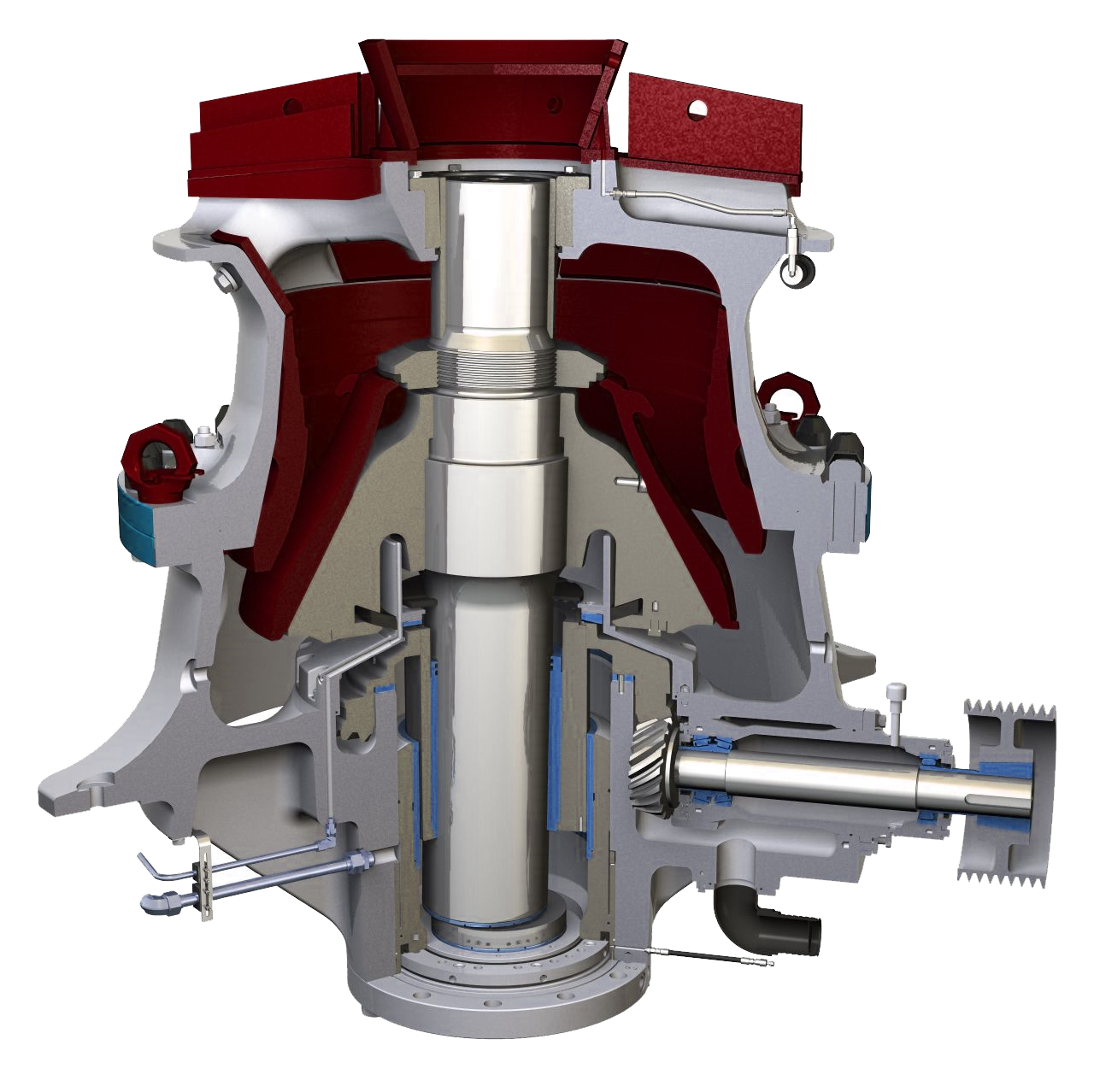 1.Крышка верхнего подшипника 2.Верхний подшипник 3.Контргайка 4.Мантия 5.Подвижный конус 6.Главный вал 7.Верхняя рама 8. Вогнутый Lockbolt 9.Вогнутый 10.Пылезащитное уплотнительное кольцо 11.Шестерня 12.Горизонтальный контрвал 13.Шкив 14.Нижняя рама 15.Большая шестерня 16.Эксцентриковая втулка 17.Упорный подшипник 18.Гидравлический цилиндр.